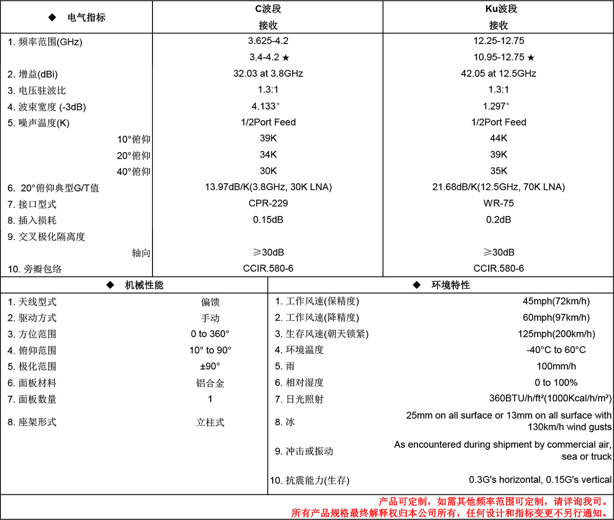 稳定性高;华信 1.2米C/Ku波段偏馈卫星接收天线指标